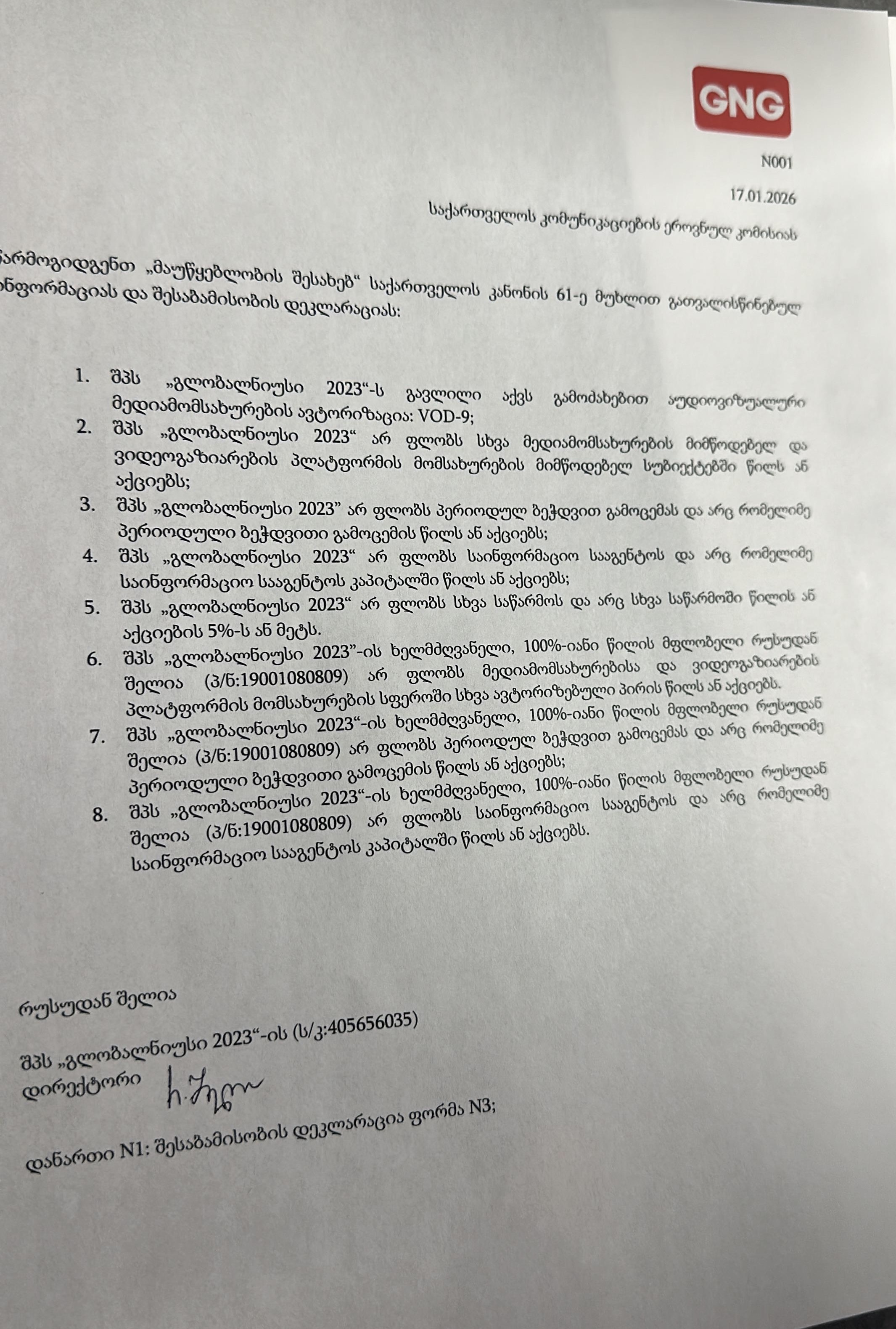 კომისიაში 61 მუხლის თანახმად- წერილი გლობალნიუსი 2023 წლის 2026